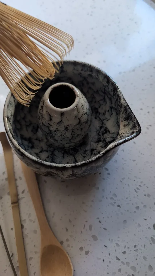 Ce bol n'est pas un simple Chawan, c'est un Kataguchi. Sa forme spécifique avec un bec verseur intégré est conçue pour faciliter le transfert de votre matcha fouetté vers une autre tasse, un bol de lait chaud, ou sur des glaçons. C'est l'outil indispensable pour réaliser des **lattes visuellement parfaits** sans en mettre à côté. Sa céramique rustique conserve idéalement la chaleur.